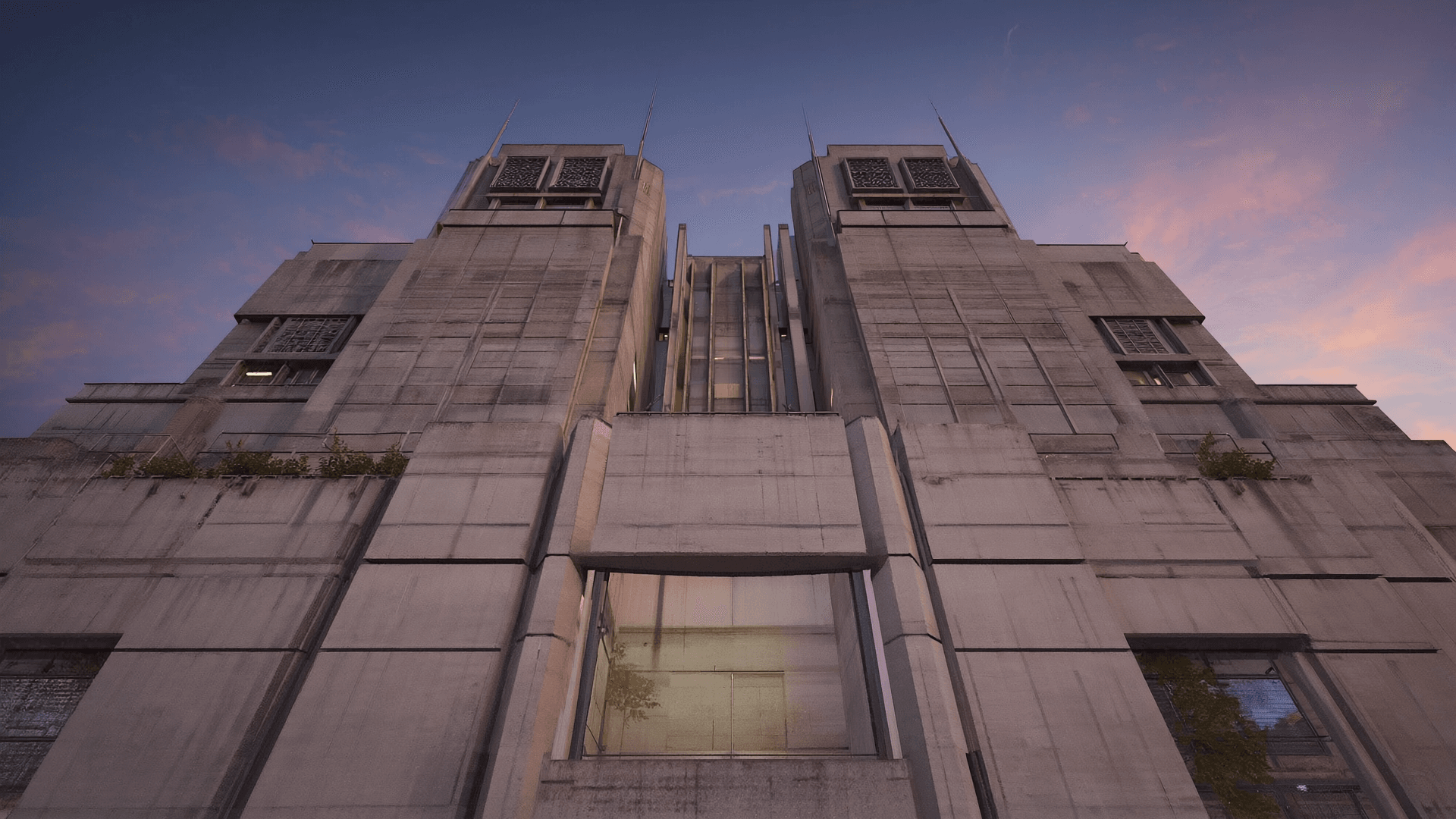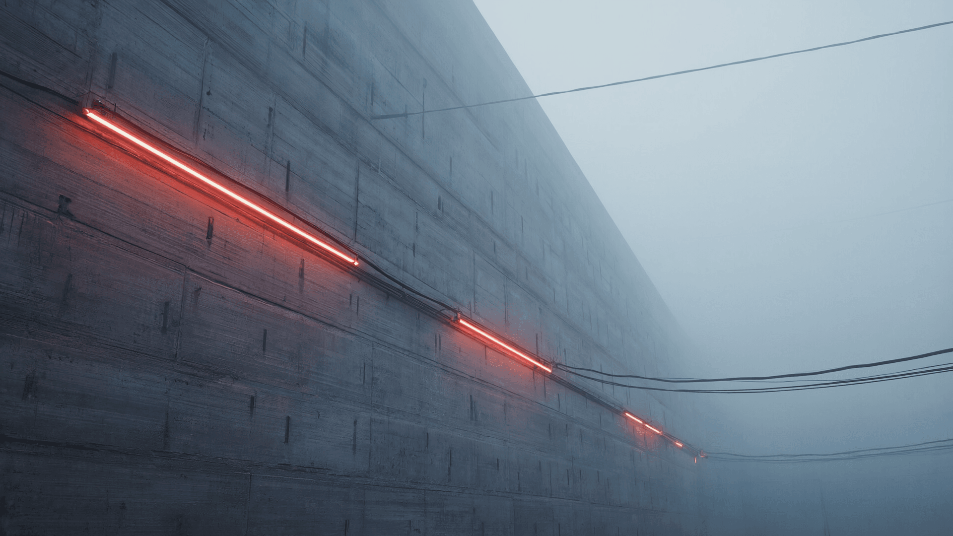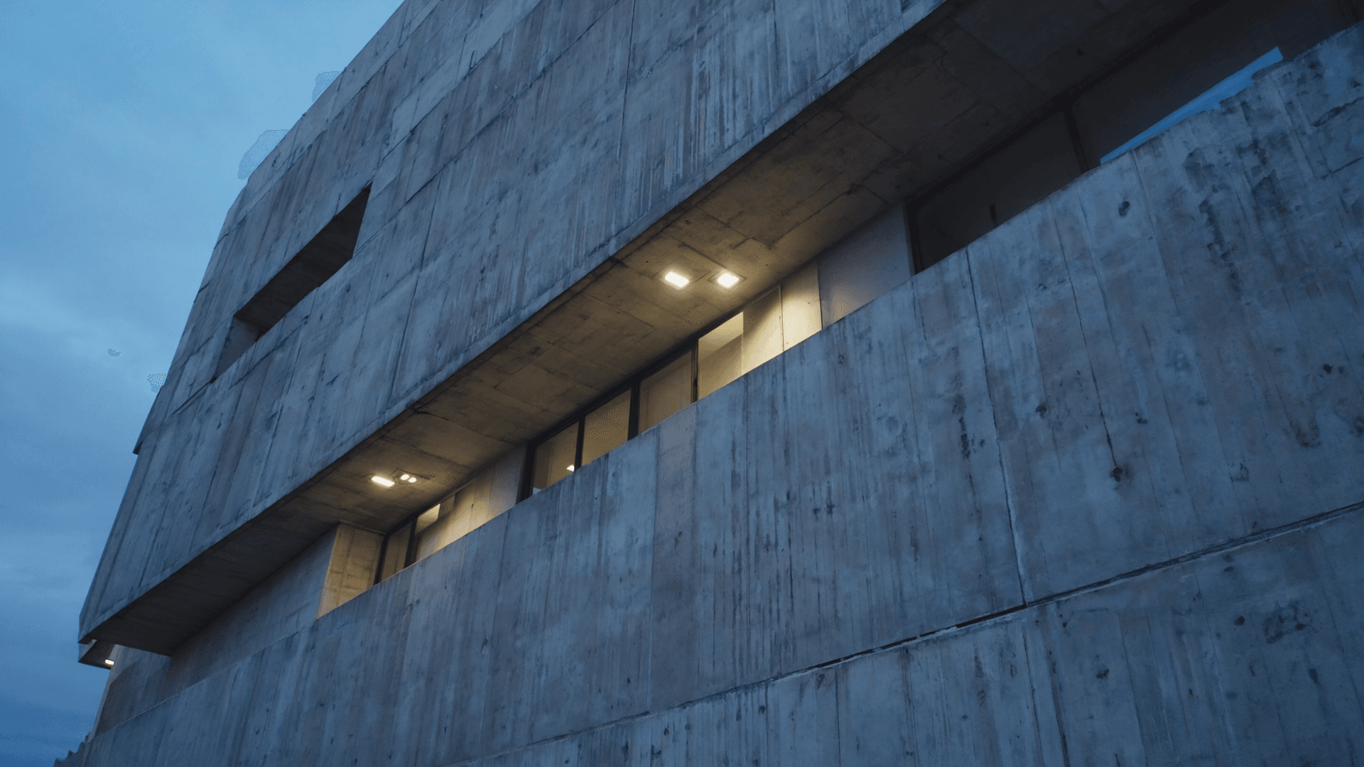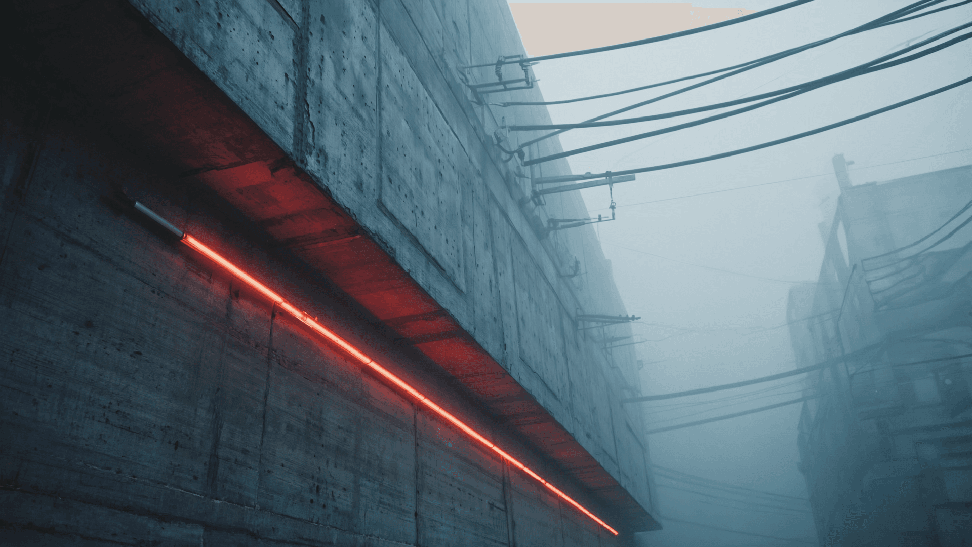 At night, cold neon light meets rough concrete. Brutalism becomes futuristic, cinematic, almost unreal.